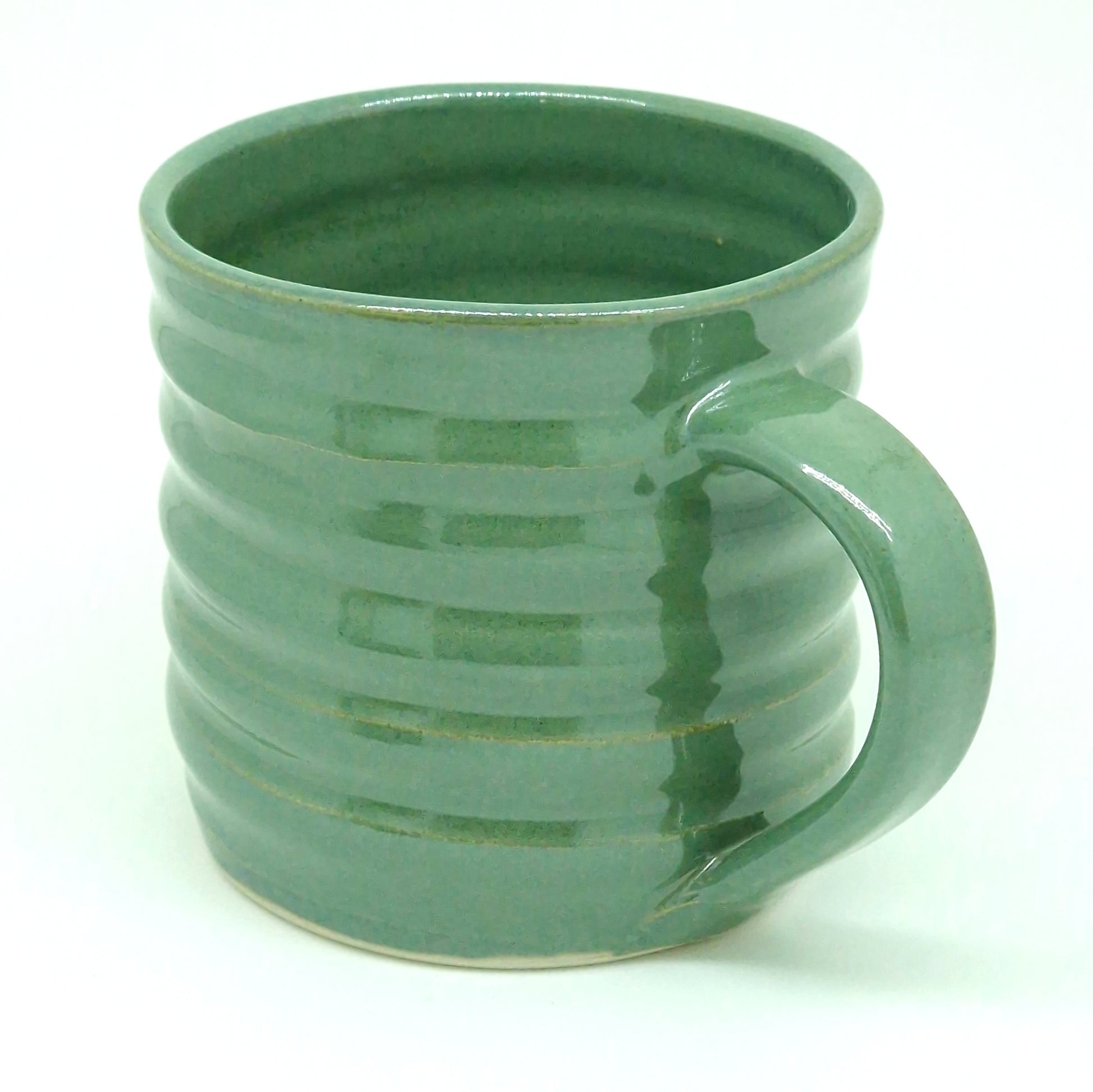 Glossy, green, hand-thrown stoneware mug