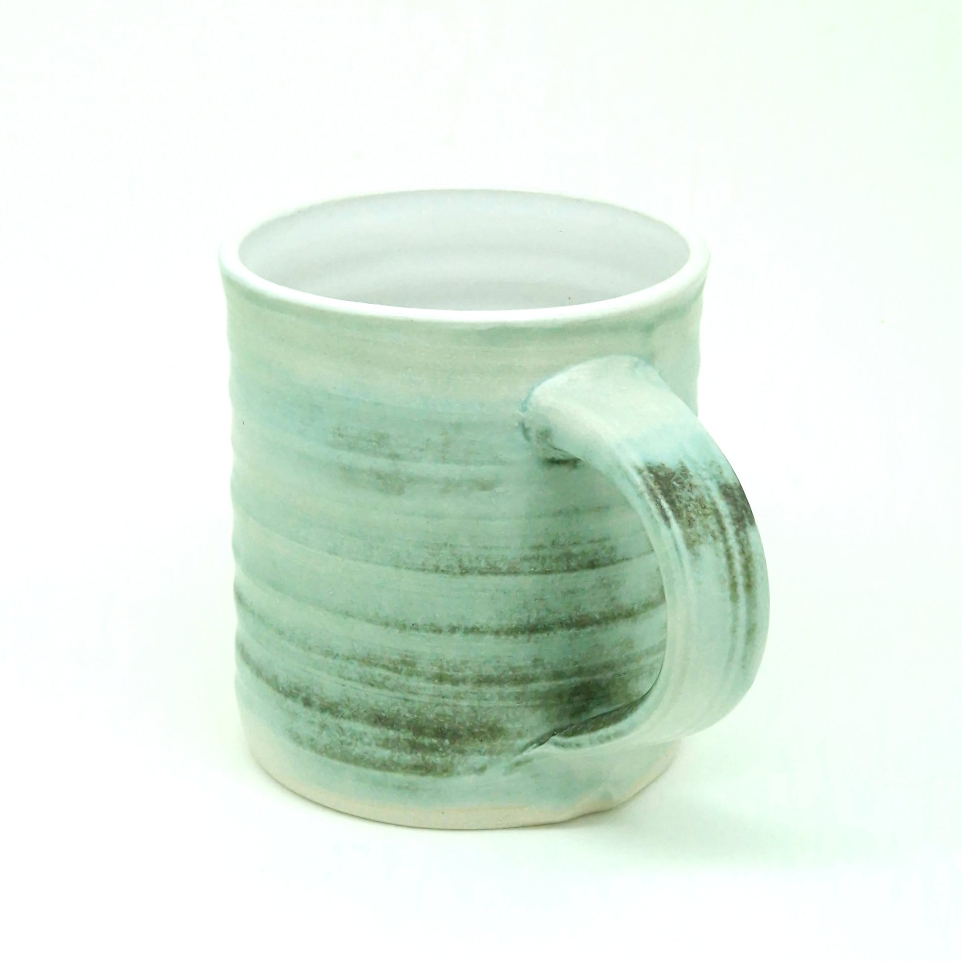 Stoneware mug, with a teal outer glaze and white, stain-resistant liner glaze.