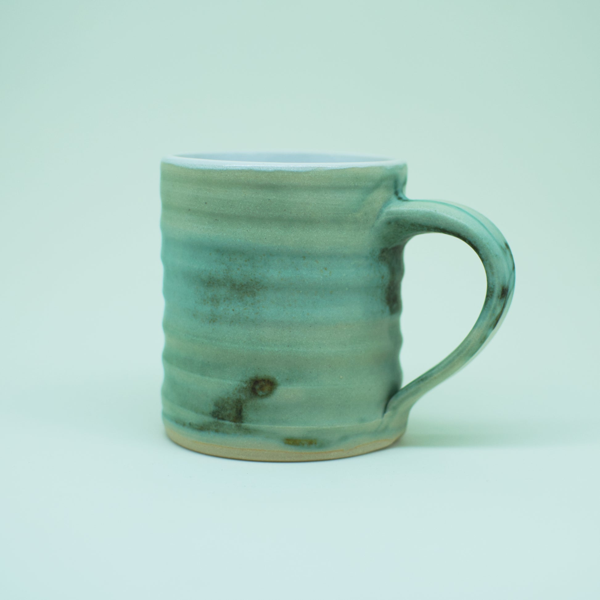 Stoneware mug, with a teal outer glaze and white, stain-resistant liner glaze.